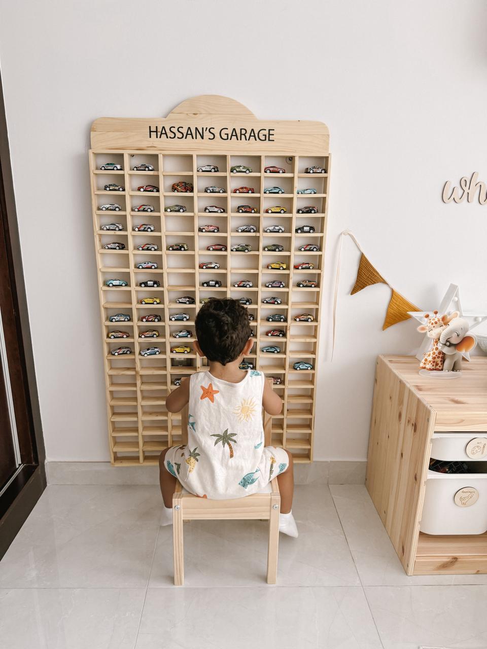 Our handcrafted wooden toy garage stores up to 105 toy cars. Add your child’s name for a personal
